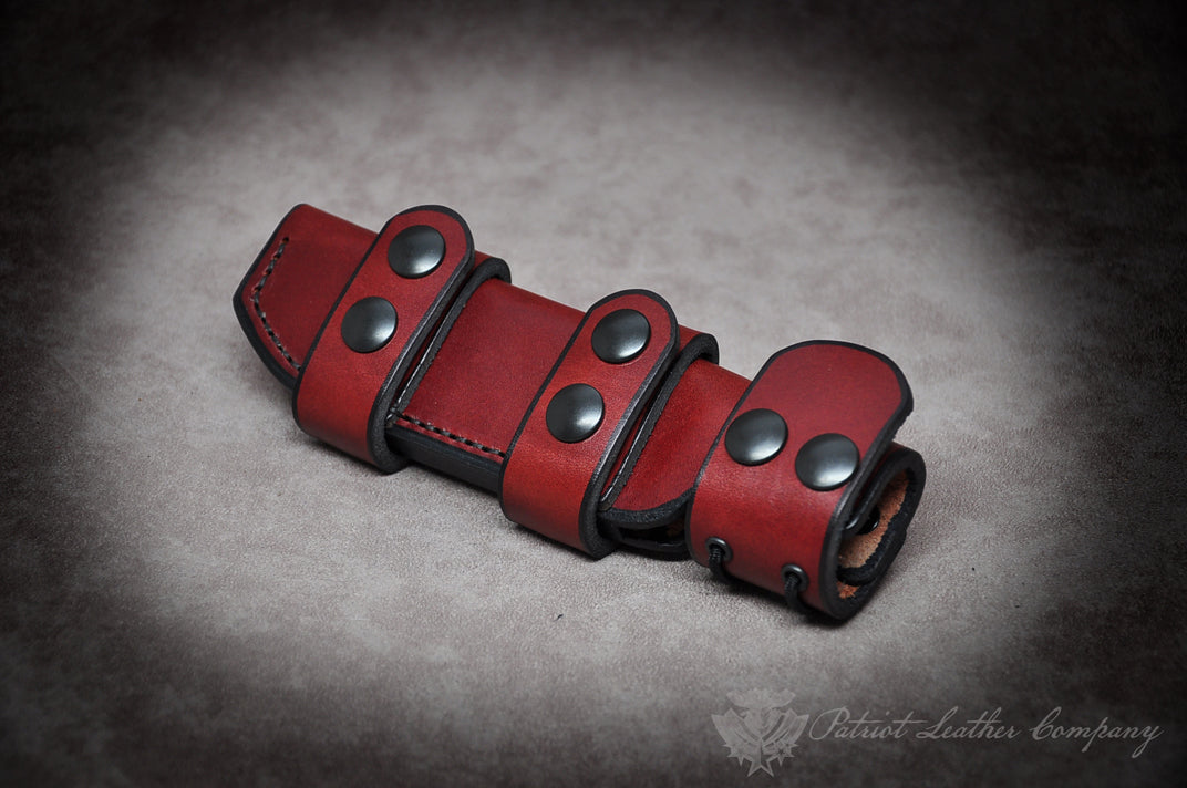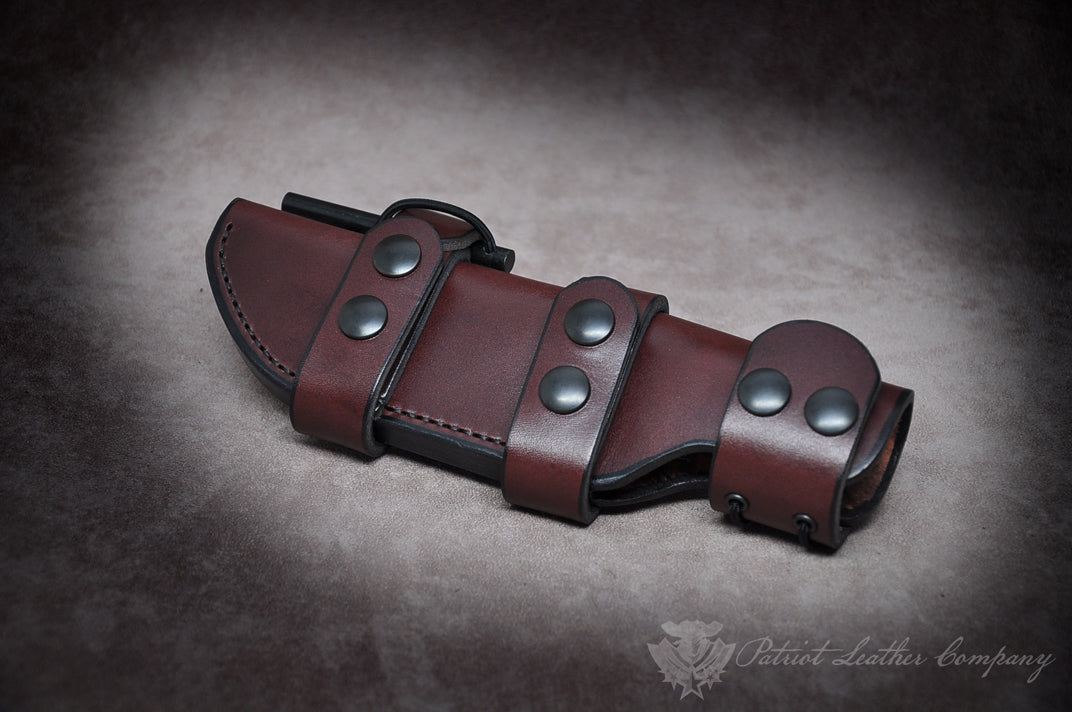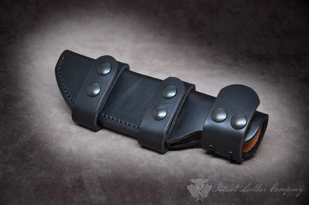The Explorer is a versatile minimalist horizontal Scout Carry sheath, customizable for a range of small to large fixed blades. Crafted with 10oz Premium Hermann Oak Bridle Leather, it boasts superior weather resistance and durability. Military grade snaps and hardware, along with a patented Hedgehog Rapid Release system, make for secure and efficient handling. It offers horizontal Small of Back carry and Molle compatibility for pack carry, fitting belt widths up to 2".