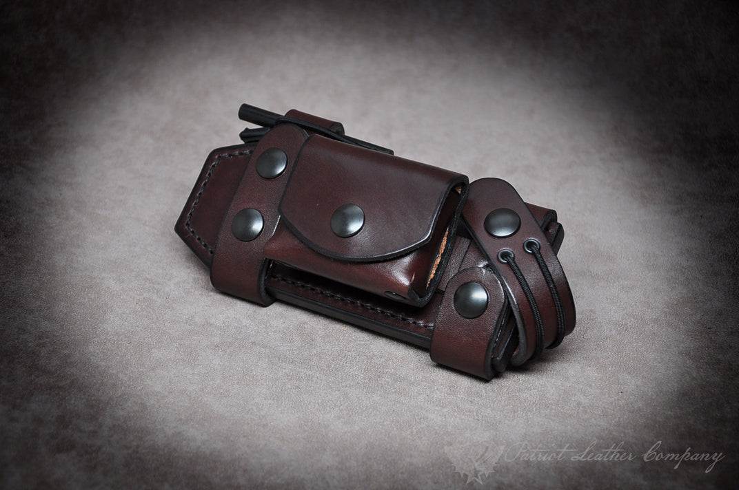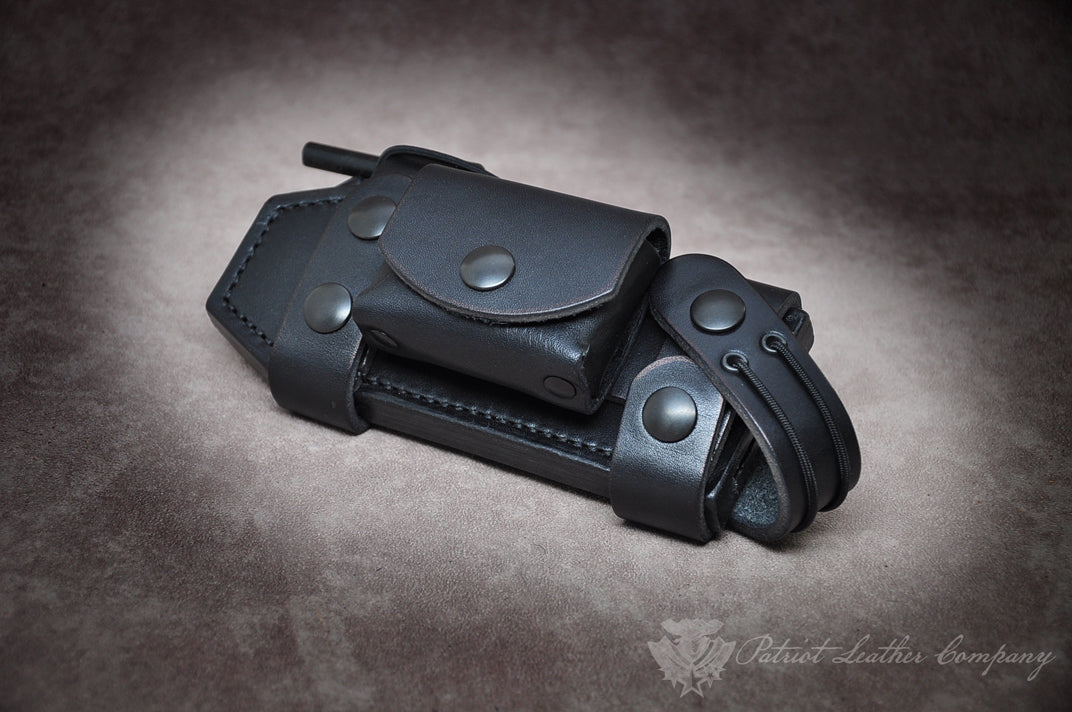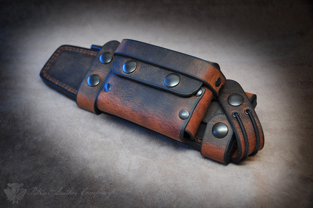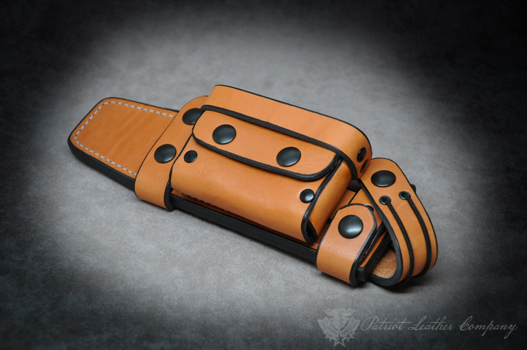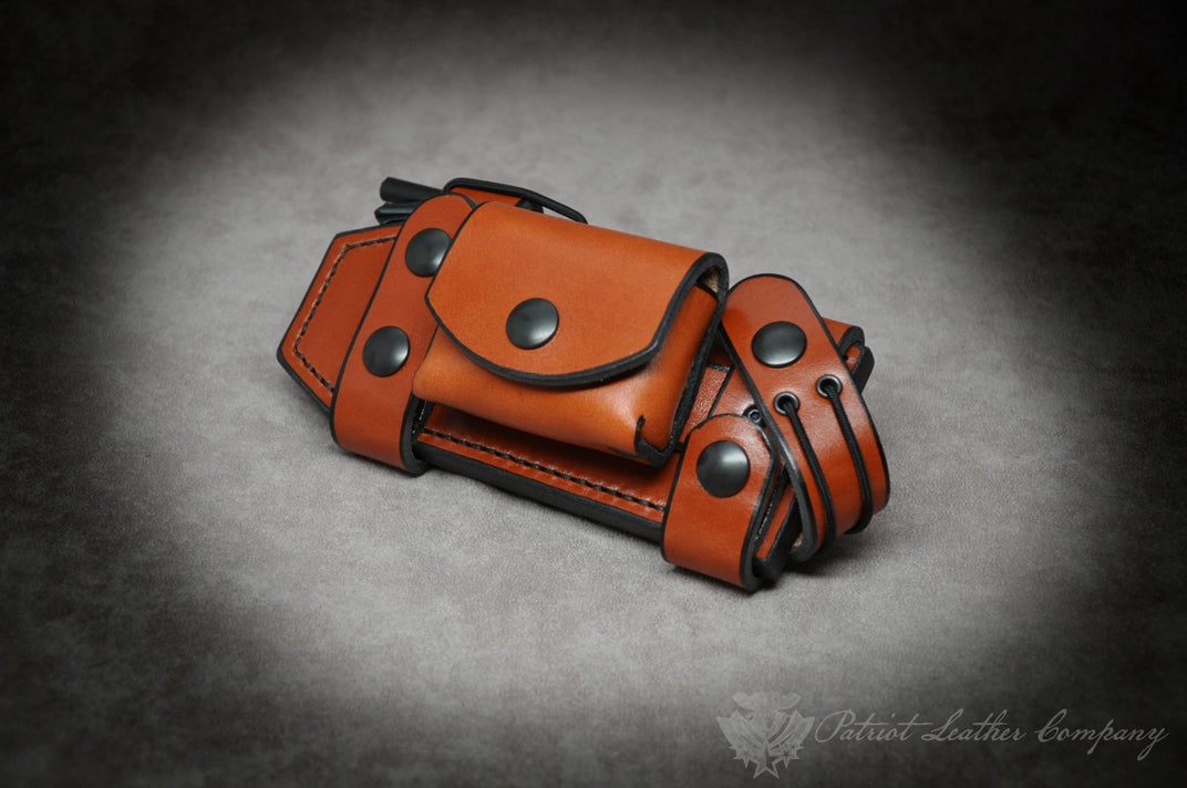 The Fusion model is a Scout Carry sheath designed for small to large fixed blades. The smaller pouches are built for 3-6 inch blades, and the larger tin pouches are built for 7 inch and longer blades. Made from 10 ounce Premium Hermann Oak Bridle Leather, this sheath offers superior weather resistance and durability. It features military grade snaps and hardware, will fit belt widths up to 2" and can be carried horizontally at the small of the back or attached to a pack using Molle compatibility. Additionally, it offers the patented Hedgehog Rapid Release System for quick and easy access.